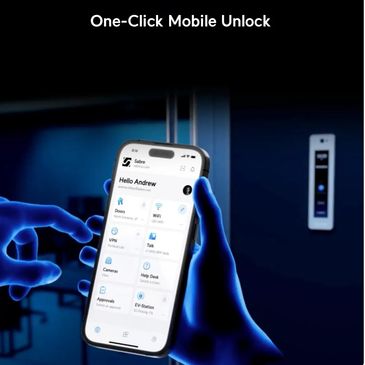 Secure your business with one-click profiles. Set up employee profiles "itentitythat allow them to have unique access to doors and networking. Secure doors with keypads with built-in cameras, and open them with your phone or the wave or your hand.